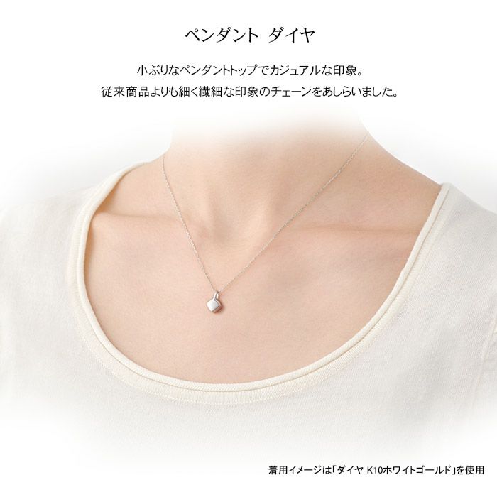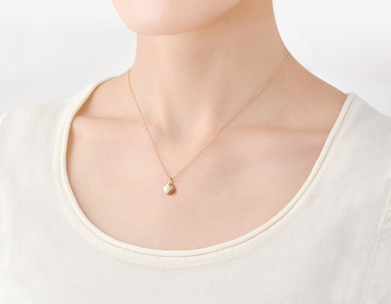 シンプルなひし形(ダイヤ型)のプチペンダント。直線的なバチカンとの組み合わせでよりシャープな印象に。チェーン線径は従来商品よりも細く(0.3㎜φ)、装着した際に繊細な雰囲気となります。トップ、チェーン共にK10製です。