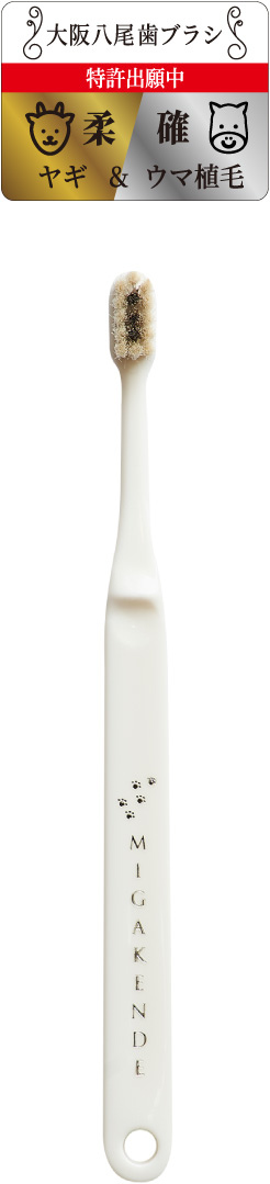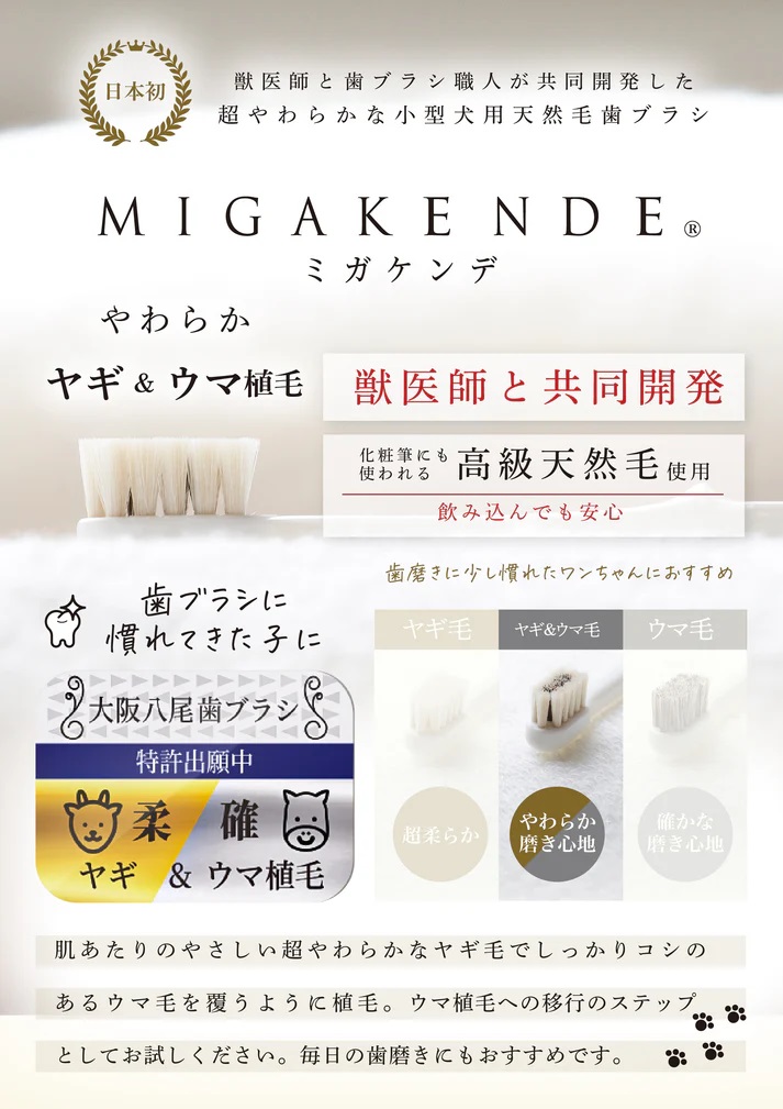 日本初!柔らかいヤギ&確かな心地のウマの天然毛歯ブラシ 高級化粧筆にも使用される極細天然毛を用いた犬用歯ブラシ、MIGAKENDE。 獣医と共同開発され、磨き心地が良く、毛の本数が通常の歯ブラシより多いため、愛犬の歯垢を効果的に除去。 70年の職人がひとつひとつ丁寧に植毛。 「いつまでも健康に、ずっと一緒に。」をテーマに、多くのワンちゃんと家族が長く健康で幸せな生活を送れるように、この商品が生まれました。