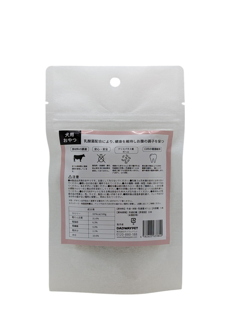 国産牛皮と米粉に機能性をプラスした、風味豊かなスティック状の犬用おやつ。