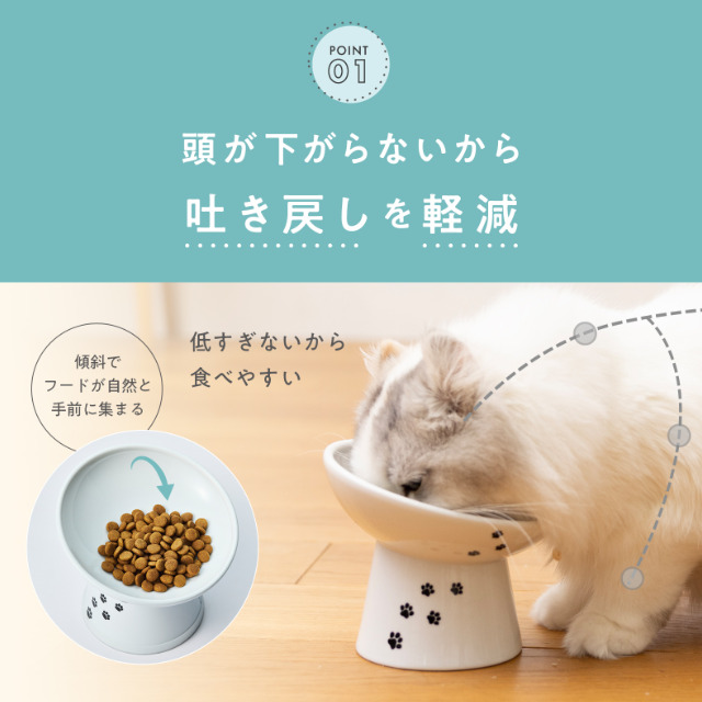 自然とフードが手前に集まる!食べやすさを極めた「にゃにゃめ」のレギュラーサイズ。 【食べやすさの新常識:斜め15度】 ボウルに斜めの傾斜をつけることで、フードが自然と手前に集まる設計です。猫が顔の位置を変えずに最後まで食事ができるため、食べやすさが格段にアップしました。猫壱ファンの声から生まれた、にゃにゃめ形状です。 【吐き戻しを軽減する高さ】 猫は食道が比較的まっすぐな動物です。低い位置での食事は逆流を招きやすいもの。頭と喉を下げずに自然な体勢で食事ができるため、嚥下を助け、一気食いによる嘔吐や吐き戻しの負担を軽減します。 【こぼれにくく、食べやすい「かえし」形状】 ボウルの内側には適度な丸みと厚みを持たせた「かえし」がついています。フードが自然と中央に戻る設計で、食べるのが苦手な子や、縁を使って食べる子でもストレスなく食事が可能。食べこぼしも防ぎます。 【毎日使うものだから、扱いやすさも追求】 磁器製なので温めたフードも冷めにくく、プラスチックや陶器よりも硬くて丈夫。電子レンジや食洗機にも対応しており、毎日のお手入れも簡単です。 【シンプルで可愛いデザイン】 ボウルには透明感のある白磁を生かしたシンプルな猫のシルエット。脚部分には猫の足跡をあしらいました。