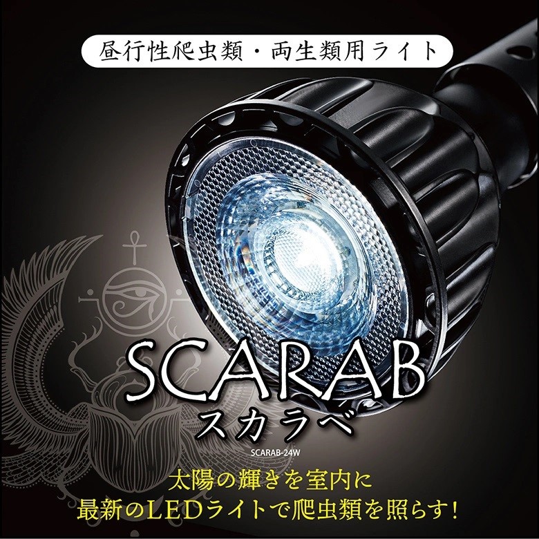 『スカラベ』は昼行性爬虫類・両生類・植物育成用ライトです。 自然光の中に含まれる7色の可視光の照射を実現! 爬虫類・両生類の本来の体色を鮮やかに演出します。 テラリウム、ビバリウム内の爬虫類・両生類と共に、植物の育成にも最適なライトです。 飼育環境を明るく照らし、生体をより美しく魅せてくれます。 ※本製品の光は、爬虫類の育成に必要な紫外線(UV)が含まれているものではありません。紫外線が必要な種類にはUVライトと併用してご使用ください。 ・1ヵ月の電気代約197円 ・80℃を超えた場合自動で本体温度を調整する加熱保護機能 ・難燃性 電気用品安全法適合製品