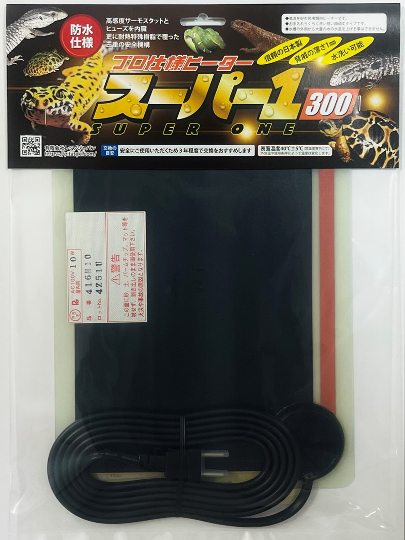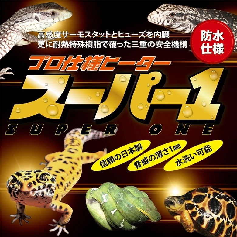 3重の安全機構を搭載したプロ仕様『スーパー1 シリーズ』! 脅威の薄さはそのままに水洗いも可能な防水仕様」です。 『スーパー1 シリーズ』は、爬虫類・両生類・昆虫・小動物に最適なフィルムヒーターです。 ピタリ適温プラスの性能はそのままに、高感度サーモスタットとヒューズを内蔵。 さらに耐熱特殊樹脂で覆った3重の安全機構を搭載しました。 しかも厚さ1mmを達成し、水洗いもできる防水仕様のプロ向けヒーターです。 ・表面温度40℃±5℃(常温環境下にて) ・高感度サーモスタット・ヒューズ内蔵 ・水洗いできる防水仕様 ・信頼の日本製 ◆高温を好む爬虫類用ヒーターです。 ◆お手入れらくらく洗いやすい超頑丈タイプです。 ◆水槽の外側から大量の水の水温を上げることはできません。 ※安全にご使用いただくため、3年程度で交換をおすすめします。