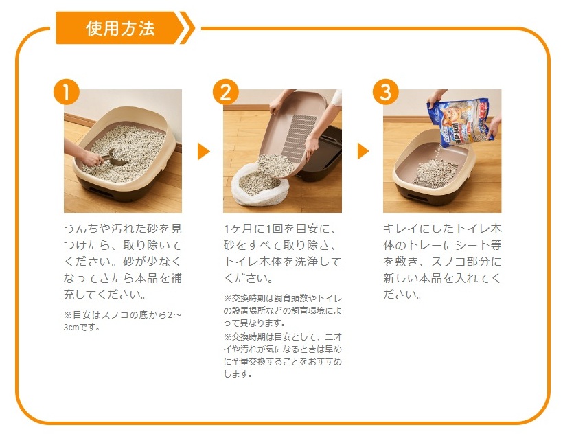 ・今まで使用していた猫砂に本品を少量ずつ混ぜて徐々に切り替えてください。または、今まで使っていた愛猫のニオイがついた猫砂を、本品を入れたトイレの中に少量混ぜて、ネコちゃんに自分のトイレであることを教えてあげてください。