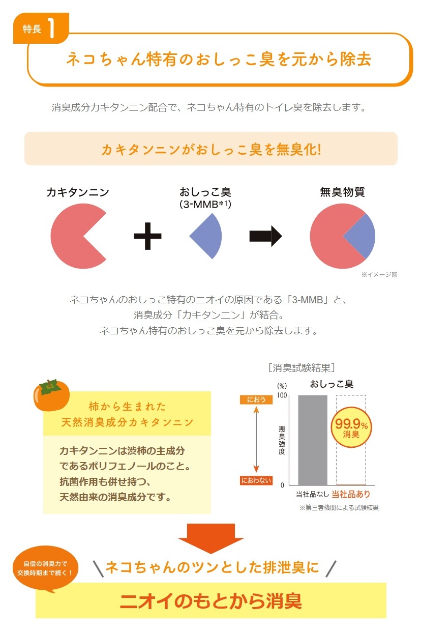 ●消臭成分『カキタンニン』の配合で、ネコちゃん特有のツンとした排泄臭をニオイのもとから消臭!