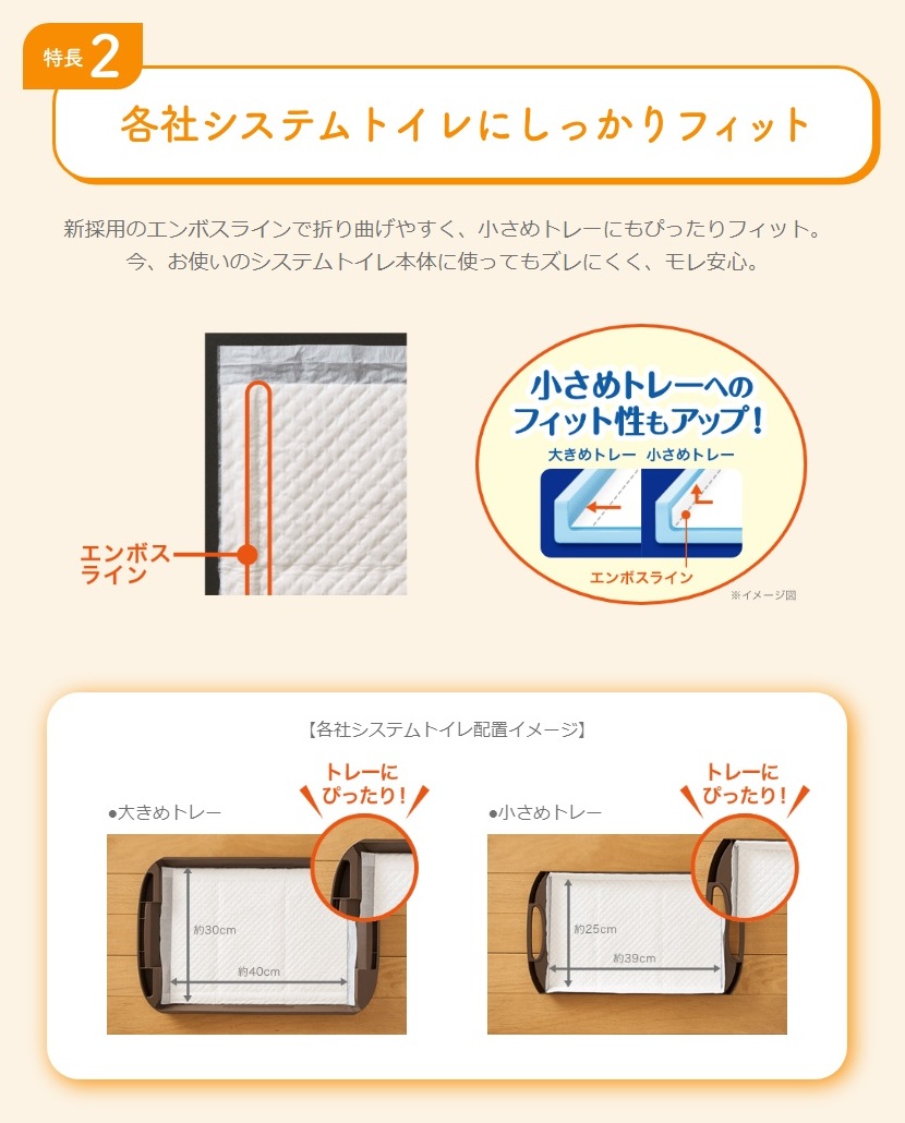 ●新採用のエンボスラインで、シートが折り曲げやすく、小さめトレーにもぴったりフィット。 ●今お使いのシステムトイレ本体に使っても、ズレにくく、モレ安心!