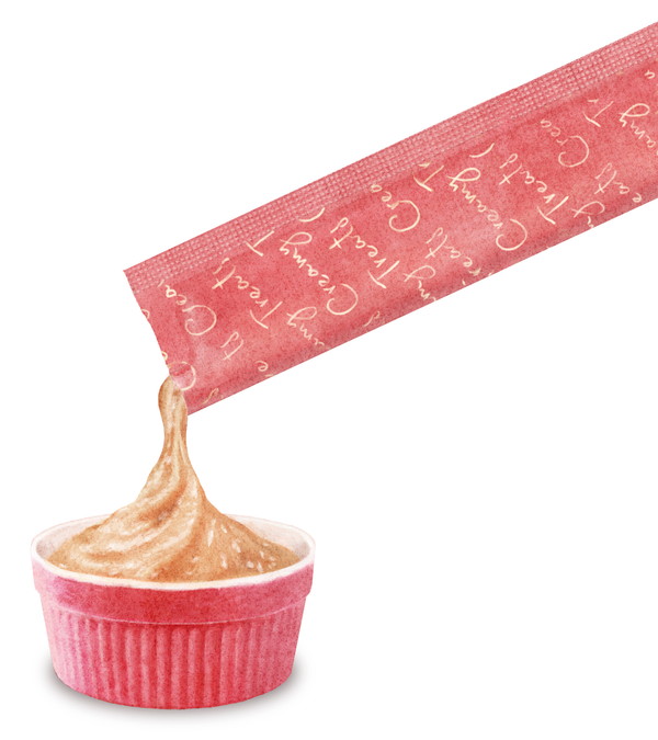 厳選自然素材を主原料に100%使用。お肉やお魚など、素材のおいしさがお口いっぱいに広がるクリーミータイプのおやつ。