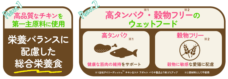 高タンパク・穀物フリーのウェットフード 肉食の猫が本能で求める抜群のおいしさと、高タンパク・穀物フリーを実現したウェットフード。食が細くなってきた愛猫のために、食べやすいクリーミーなペーストタイプ。シニア猫の衰えがちな消化吸収に配慮し、カロリーと脂質を成猫用製品より高めに設定。
