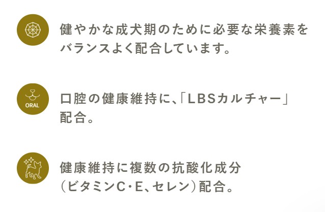 この製品は、ペットフード公正取引協議会の定める分析試験の結果、「総合栄養食/成犬期用」の基準を満たすことが証明されています。