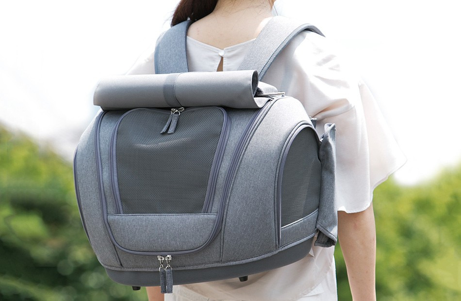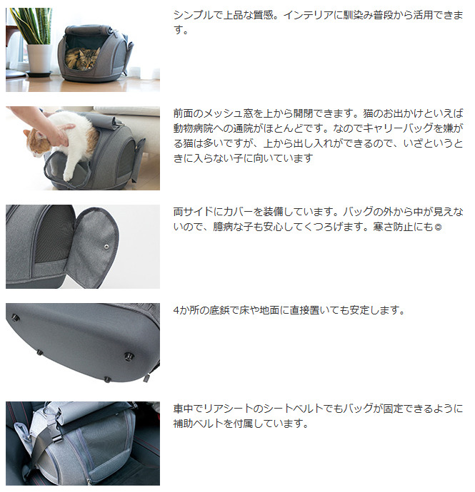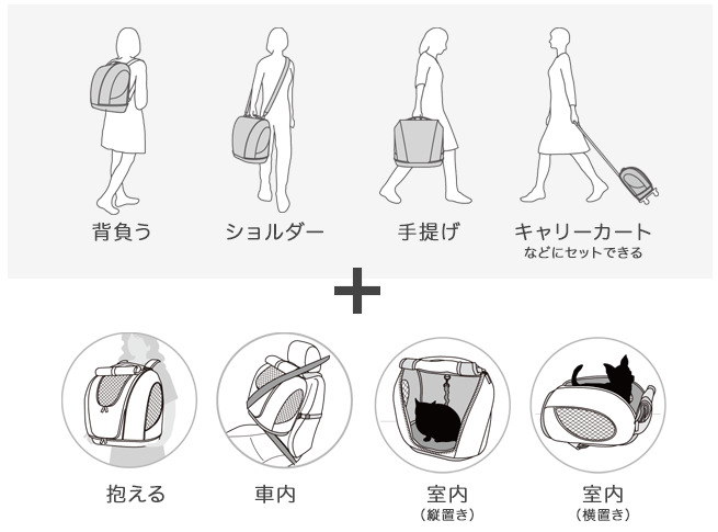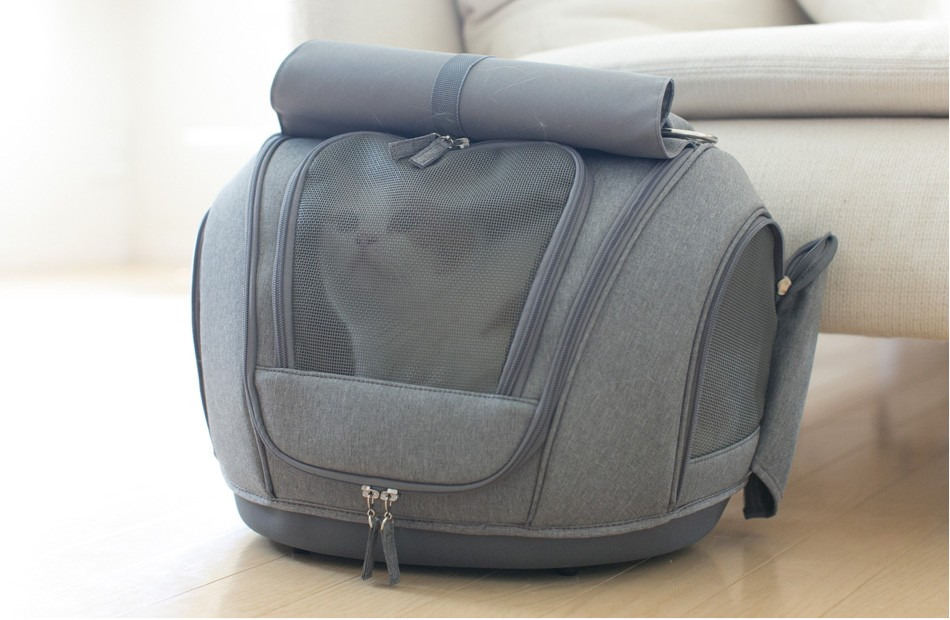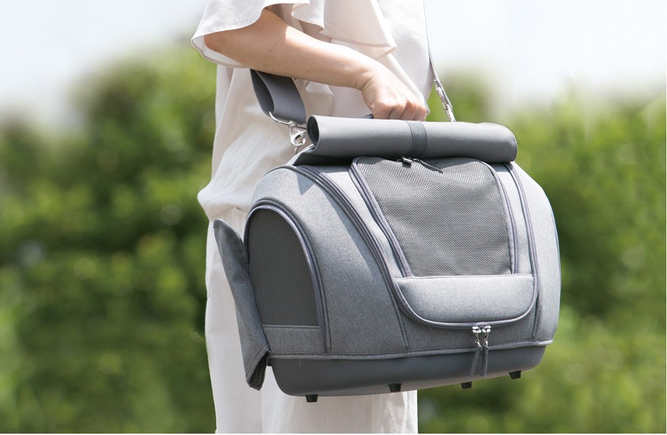 ペットキャリアミュナFLは奥行きが広く、寝転びやすく、丸まりやすい構造です。猫にとって安心できる居心地のいい場所をしっかり確保できます。 リュック・ショルダー・手提げ・キャリーにセットという4通りの持ち方ができます。6㎏までの小型犬にもお使いいただけます。