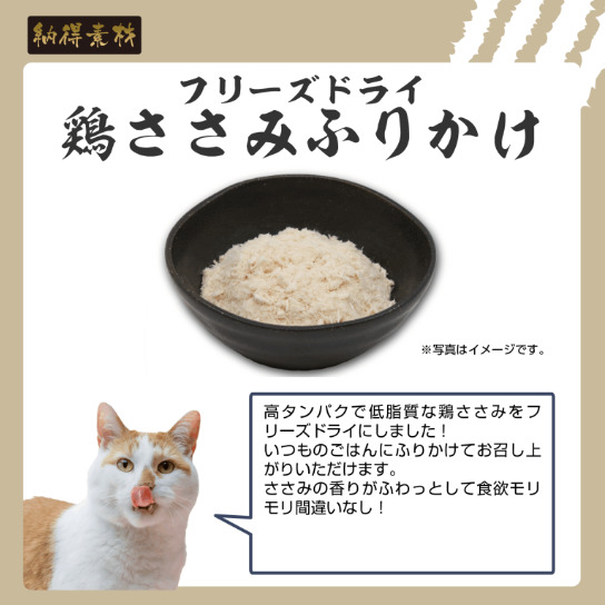 ささみの旨味と香りと栄養をそのままギュッとフリーズドライにして閉じ込めました。 キャットフードに混ぜてもそのままでも与えることができます。