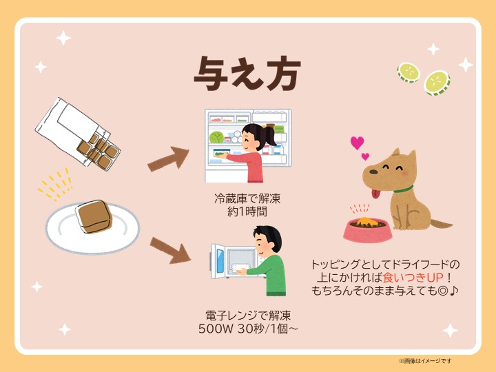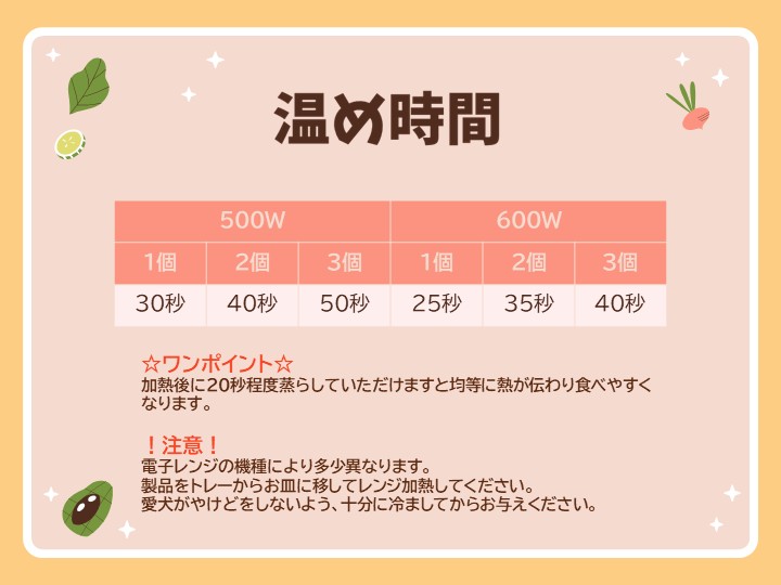 お好みで電子レンジで温め、十分に冷ましてからお与えください。