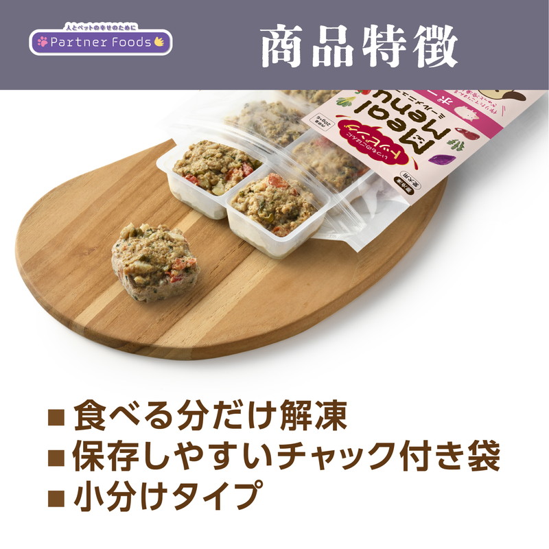 ワンちゃんの好きなさつまいもが入ったメニューです。 ビタミンB1を含む豚肉をメインに、βカロテン・ビタミンCを含む赤パプリカなどの野菜やめかぶを使用。 たんぱく質・鉄分・亜鉛・ビタミンAを含み嗜好性の高い鶏レバーとさつまいもを使用したワンちゃんのだいすきなごはんに仕上げました。 【アレルギー】鶏肉、豚肉、りんご