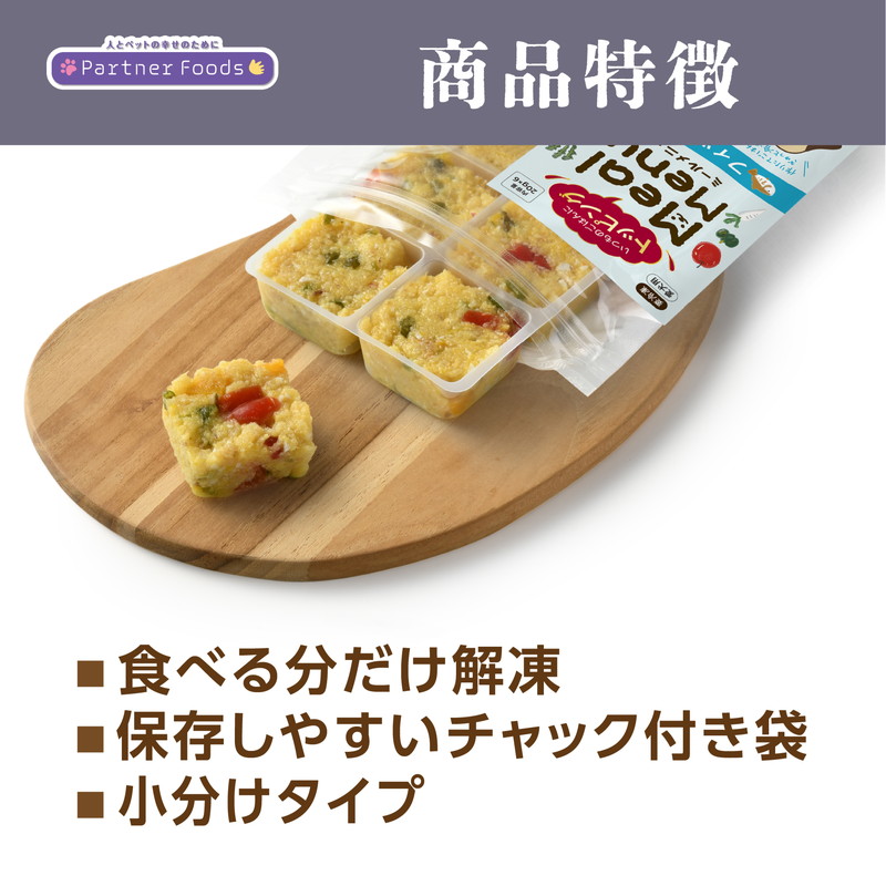低脂質*のタラに野菜を合わせたメニューです。 鶏むね肉よりも低脂質・低カロリーのタラとたんぱく質を含むゆで卵を使用し、βカロテン・ビタミンCを含む赤パプリカ、ビタミンC・消化酵素も持つ大根入りで、シニア犬にも優しいごはんに仕上げました。 *同社「MealMenu Kitchen チキン」と比較 【アレルギー】卵、りんご
