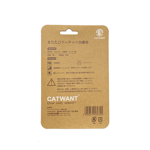 リアルなドーナツは豊かな色彩と可愛らしいデザインに仕上げました。ドーナツの芯はすべてマタタビで作られており、完全に植物由来の製品です。着色料は一切使用せず、すべて天然植物の色合いで、安心安全!虫えい果の粒が猫ちゃんの遊び心を刺激します。またたびと虫えい果好きな猫ちゃんへ!