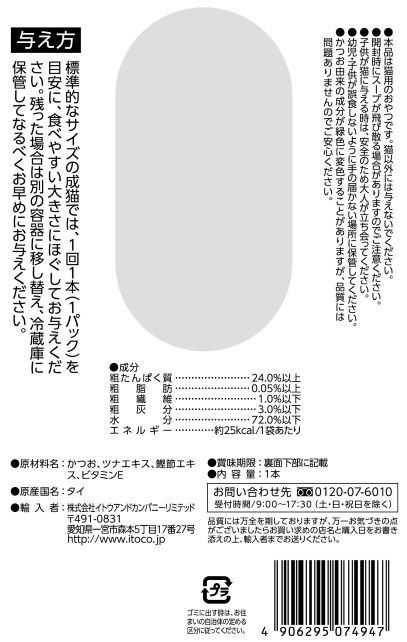 かつおの旨みをギュッとしました。 着色料・発色剤・保存料不使用です。 「猫庭」は保護猫の支援活動を行っています。 本商品の売上の一部は「猫庭」の支援に充当されます。 【与え方】 標準サイズの成猫では、1回1本(1パック)を目安に、食べやすい大きさにほぐしてお与えください。 残った場合は別の容器に移し替え、冷蔵庫に保管してなるべくお早めにお与えください。