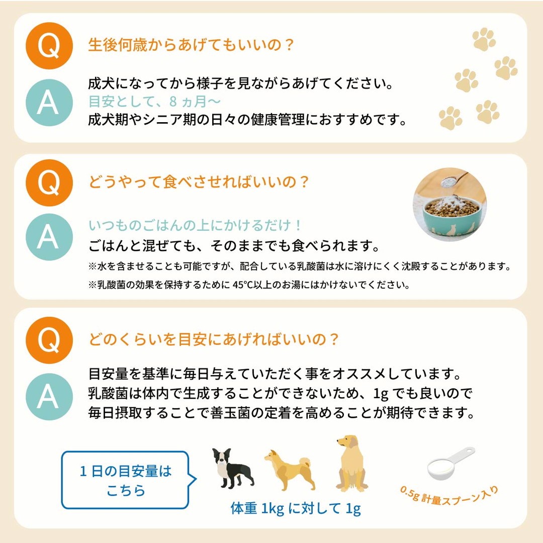 ・愛犬の体調、便の状態によって与える量を調整してください。