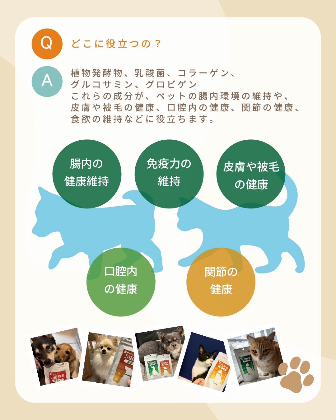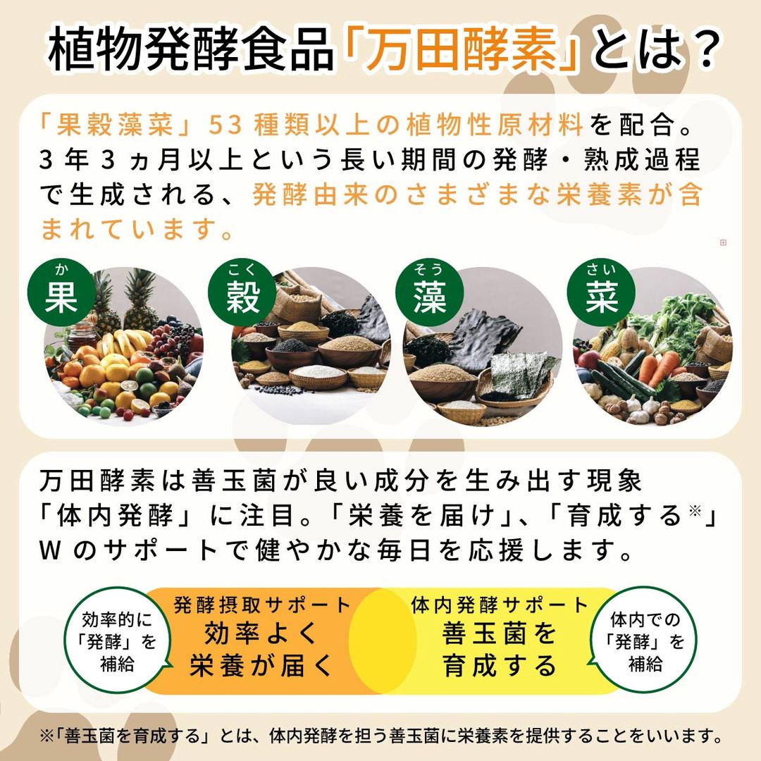 愛犬の健康をサポートするべく、万田発酵から愛犬のための新しいサプリメントができました。 ずっと健やかでいるために、あたらしいケア習慣を始めませんか? 万田酵素の発酵技術を活かした「植物発酵物」と腸内の健康をサポートする「生きた乳酸菌(フェカリス菌)」を配合しています。 さらに「グロビゲン*」も加えた口腔ケアサプリです。 *鶏卵由来由来の粉末素材 毎日の食事は、健康な腸内環境づくりと密接に関係しています。 腸内の「健康」が保てなくなると、食物の消化・分解・吸収能力・自然治癒能力の低下につながる恐れがあります。 愛犬おもいの万田酵素で、毎日の食事のサポートをしませんか? あげ方は簡単!いつものごはんの上にかけるだけ! 【使用上の注意】 ・原材料の一部に乳成分、オレンジ、クルミ、ゴマ、エビ、カニ、ゼラチン、卵、大豆、バナナ、リンゴを含んでおりますので、気になる方は獣医師にご相談の上、ご使用ください。 ・本製品は犬専用です。それ以外の目的では使用しないでください。 ・食品ではありませんので、お子さまの手の届かないところに保管してください。 ・愛犬の体調、便の状態によって与える量を調整してください。 ・愛犬に不調など感じられた場合は使用を中止し、獣医師にご相談ください。 ・中に乾燥剤(シリカゲル)が封入してあります。誤って愛犬に与えないようにご注意ください。 ・乳酸菌の効果を保持するために45℃以上のお湯をかけないでください。