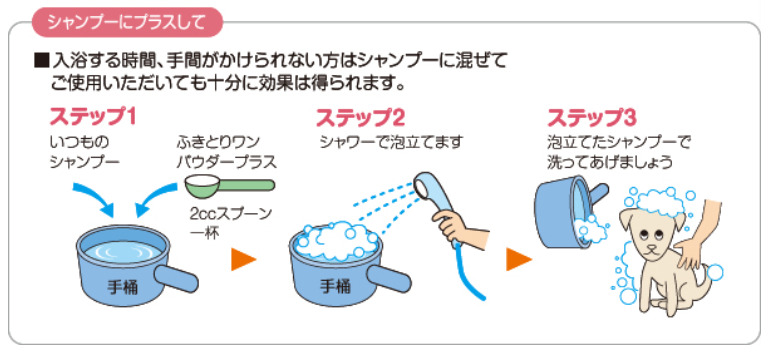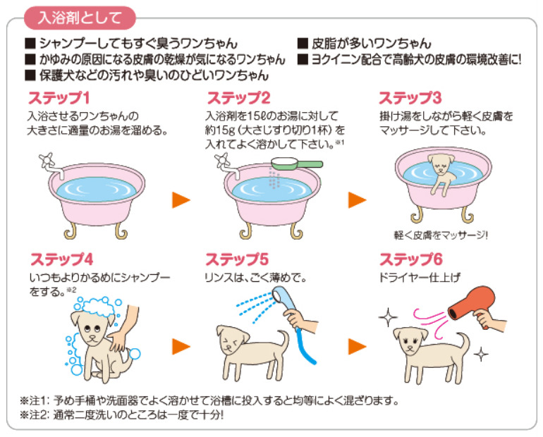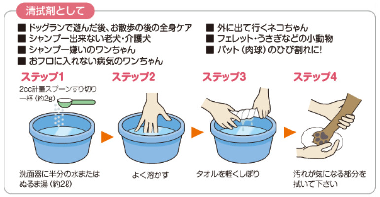 ふきとりワンが手軽に持ち運びができるようにパウダーになりました! また拭き取りだけでなく、ディープクレンジングのための入浴剤としてもご使用いただけます。 ※界面活性剤を使用せず、仔犬・高齢犬にもやさしい防腐剤無添加。 ※古い角質を取り除き、新陳代謝を活発にするヨクイニン配合! 高齢犬の皮膚の環境改善も期待されます。
