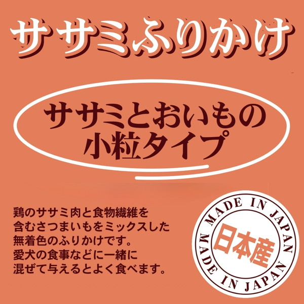 鶏ささみを使用した、定番のふりかけです。 毎日お使いいただけるお徳用サイズで、好き嫌いの多い愛犬にもオススメです。 鶏ささみ肉使用ジャーキーとさつまいもを小粒状に仕上げることでフードによく混ざり、おいしさを増すことができます。 ドライフードをなかなか食べない愛犬におすすめです。