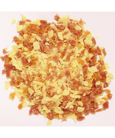 鶏ささみ肉使用ジャーキーと風味豊かなチーズを小粒状に仕上げることでフードによく混ざり、おいしさを増すことができます。