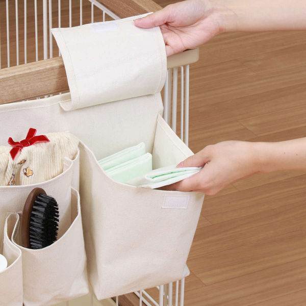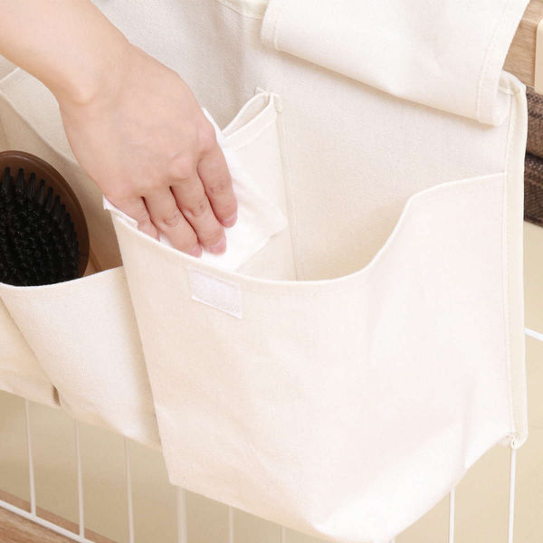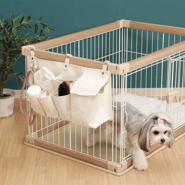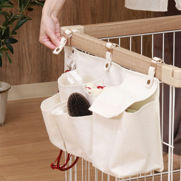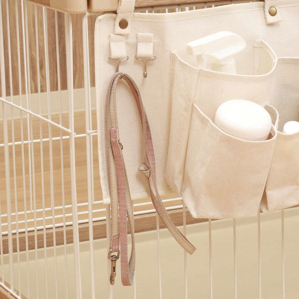 ペットケージに設置できるつり下げ収納。落ち着いた色味のファブリック素材で、お部屋に馴染むデザイン。ベルトが付いているので、ケージに合わせて調整が可能。キャンパス調の生地とゴールドのボタンが相性抜群。出し入れ簡単なポケットが付いています。大きなポケットはフタが付いているため、ホコリを防ぎます。便利なフック付きです。ポケットの内側は耐水性に優れ、水拭き可能です。