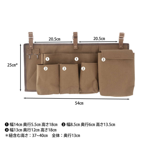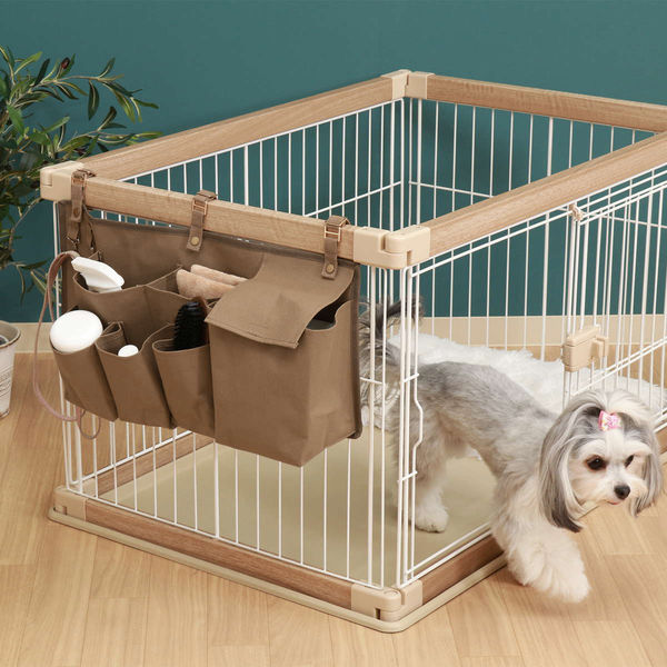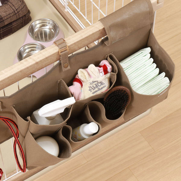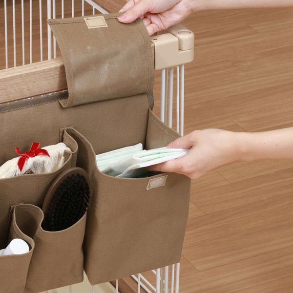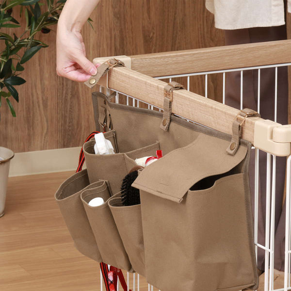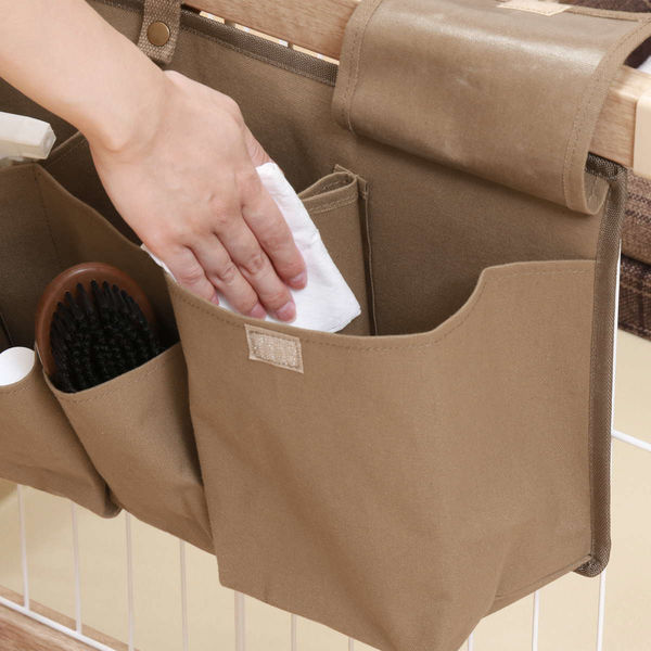ペットケージに設置できるつり下げ収納。落ち着いた色味のファブリック素材で、お部屋に馴染むデザイン。ベルトが付いているので、ケージに合わせて調整が可能。キャンパス調の生地とゴールドのボタンが相性抜群。出し入れ簡単なポケットが付いています。大きなポケットはフタが付いているため、ホコリを防ぎます。便利なフック付きです。ポケットの内側は耐水性に優れ、水拭き可能です。