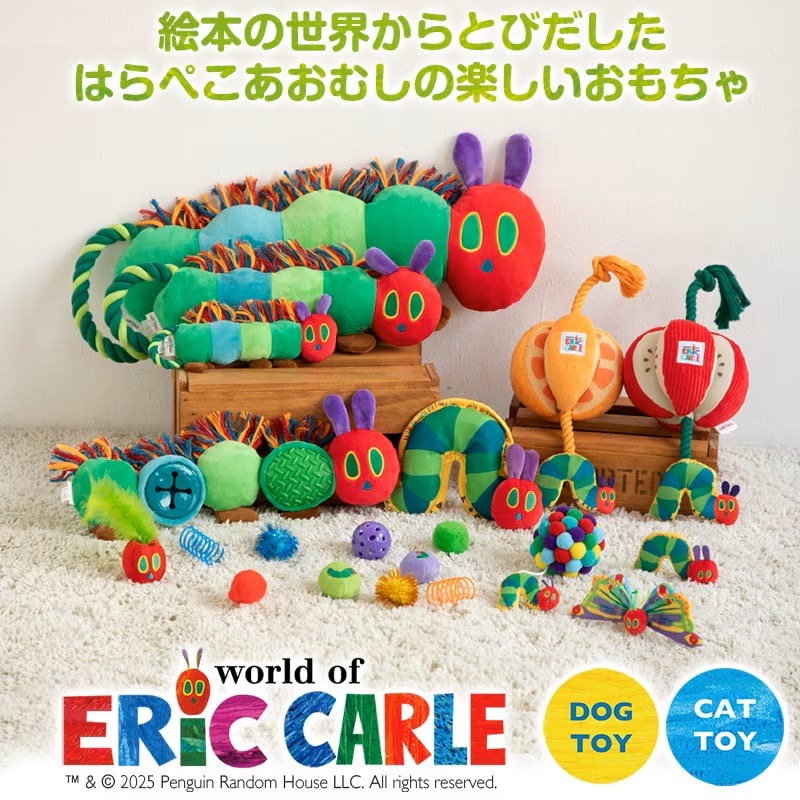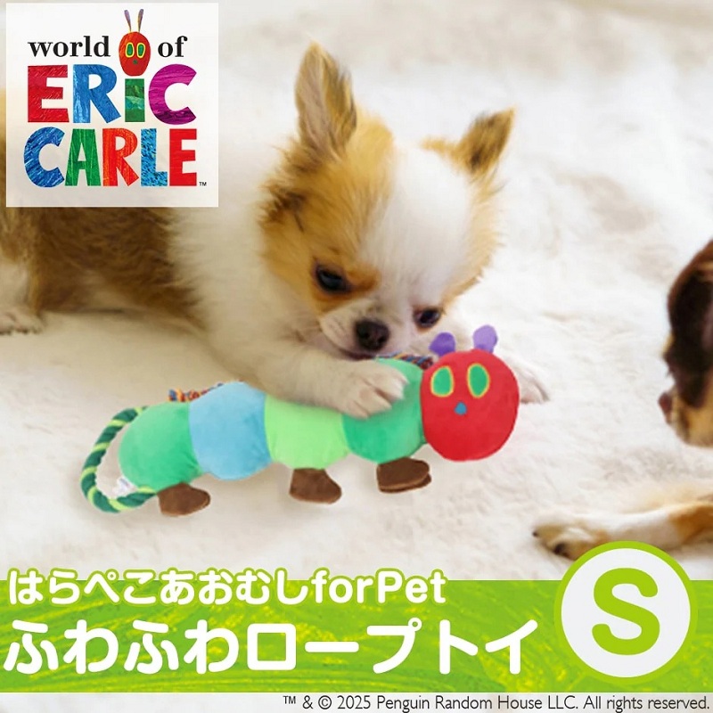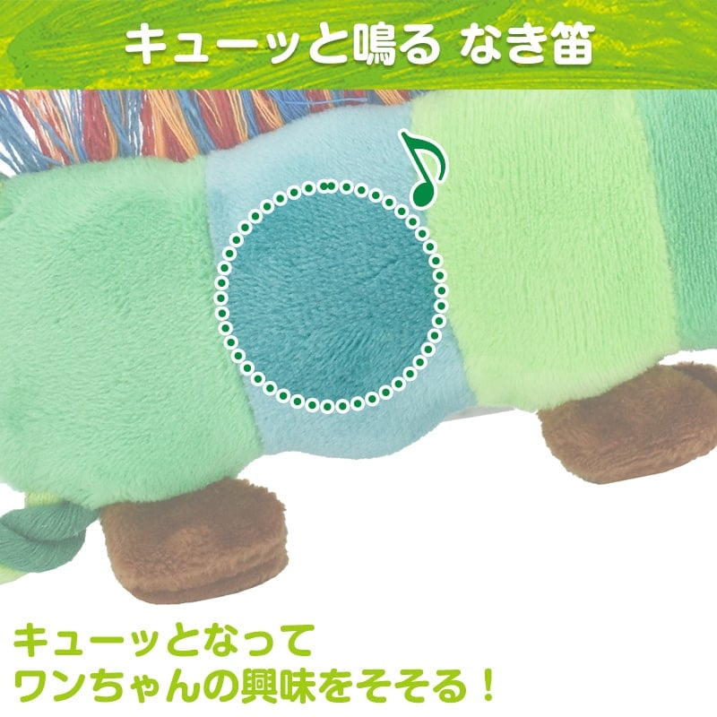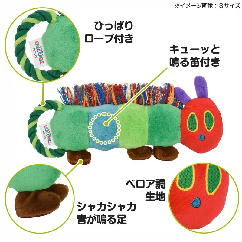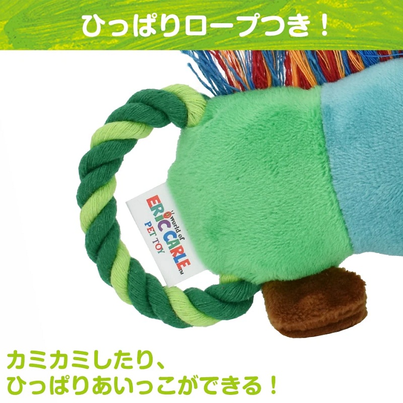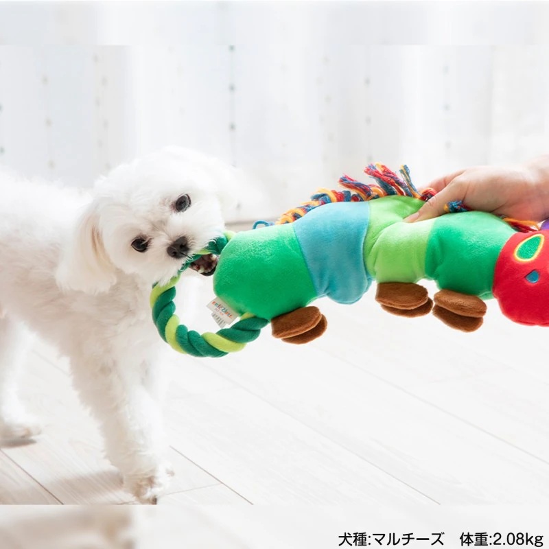 はらぺこあおむしモチーフのロープトイ 持ち運びに便利なコンパクト。室内でも野外でもワンちゃんの運動不足やストレス解消にぴったり! コミュニケーションを通じて絆や信頼を深められる 触り心地もよく、軽くて持ち運びに便利。いつでもどこでも遊びと居場所を作ることができます。 ワンちゃんが夢中になるしかけ ロープ部分はカミカミしたり、引っ張り合いっこができます。いつでも一緒のお気に入りのおもちゃとして、一人遊びはもちろん、投げてもらったり一緒に遊べます。お腹には鳴き笛入り。キューッと音が鳴り、ワンちゃんの興味をそそります。足部分はワンちゃんの大好きなシャカシャカ音!