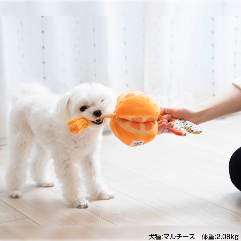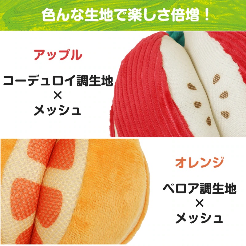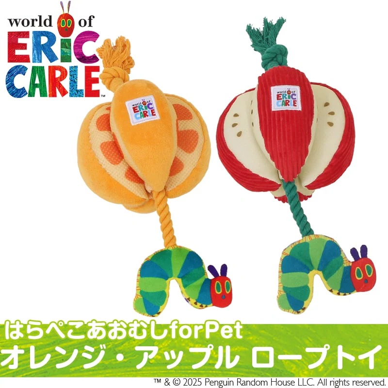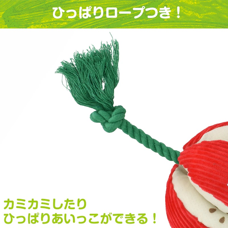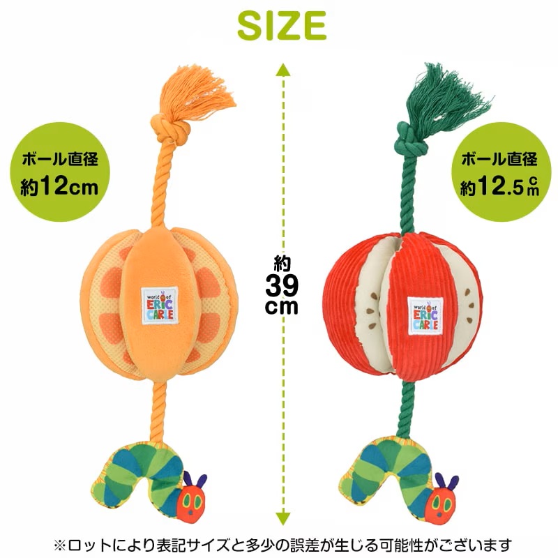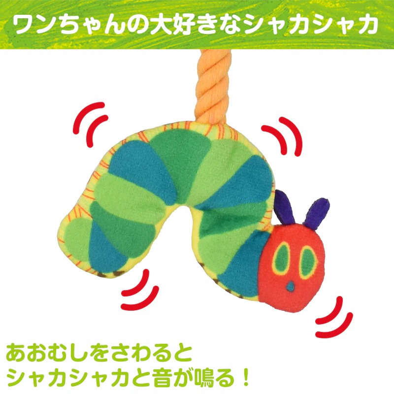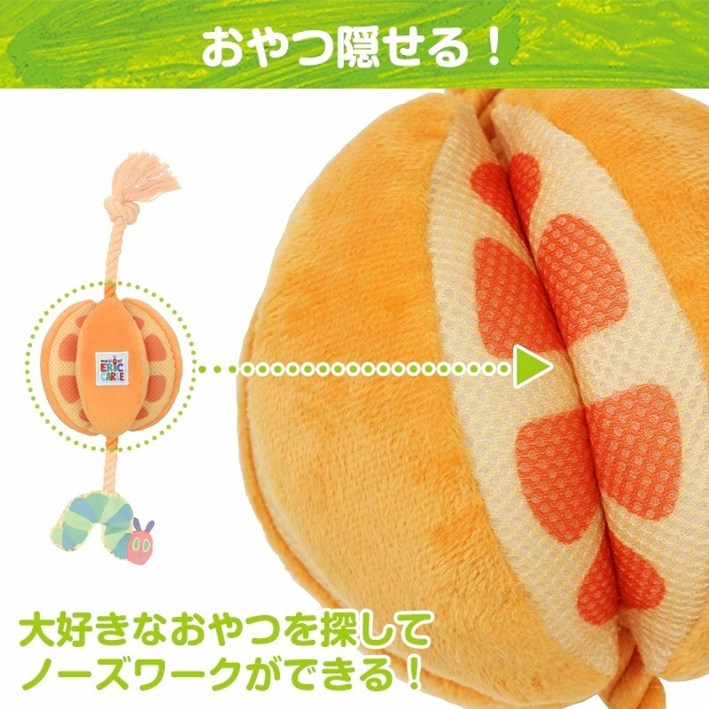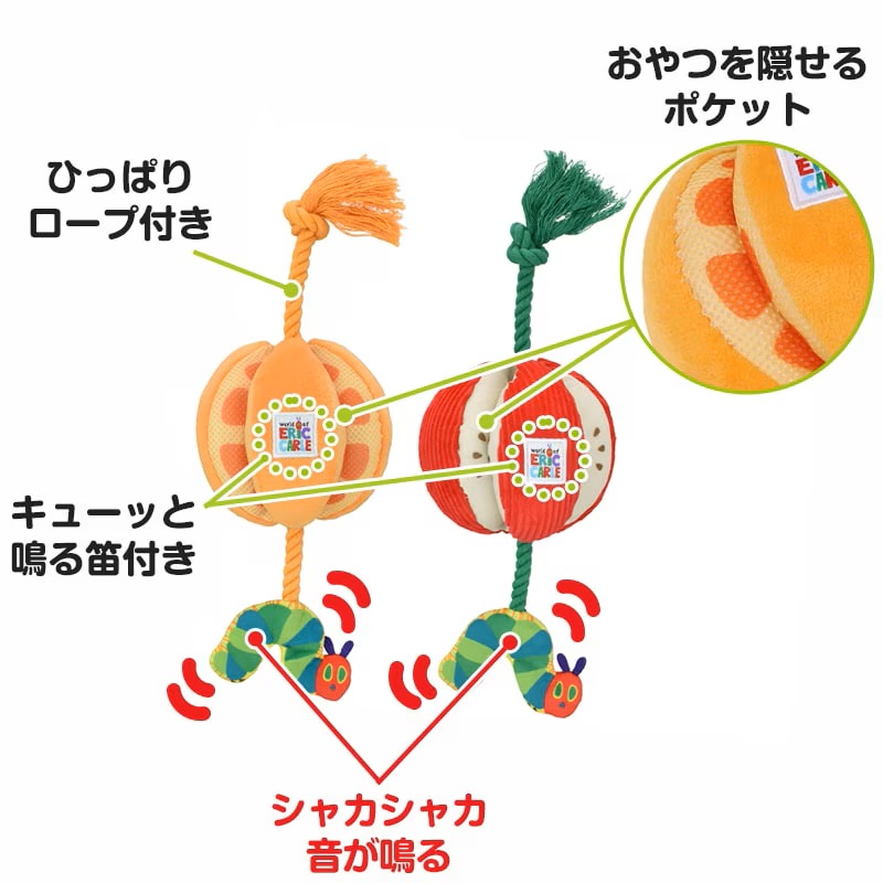 はらぺこあおむしとオレンジ・アップル モチーフのロープトイ 持ち運びに便利なコンパクト。室内でも野外でもワンちゃんの運動不足やストレス解消にぴったり! コミュニケーションを通じて絆や信頼を深められる 触り心地もよく、軽くて持ち運びに便利。いつでもどこでも遊びと居場所を作ることができます。 ワンちゃんが夢中になるしかけ ロープ部分はカミカミしたり、引っ張り合いっこができます。いつでも一緒のお気に入りのおもちゃとして、一人遊びはもちろん、投げてもらったり、一緒に遊べます。鳴き笛入りでキューッと音が鳴り、ワンちゃんの興味をそそります。フルーツのすき間のメッシュ部分におやつを隠せるからノーズワークにピッタリです。あおむしからはワンちゃんの大好きなシャカシャカ音!