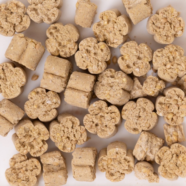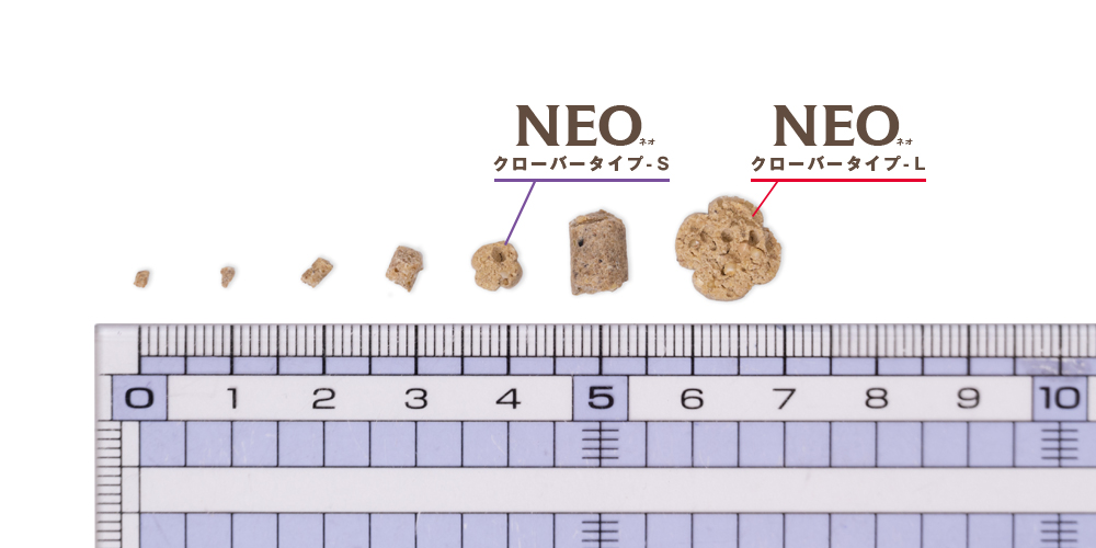 NEO クローバータイプは、その名の通り、クローバーの形をしたペレット。NEOシリーズの中で唯一ペレットにムキアワが練りこまれたタイプの総合栄養食です。