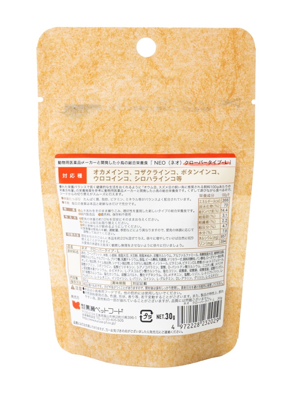 オウム目、スズメ目飼鳥に推奨される飼料100gあたりの栄養含有量(成鳥の維持量)における脂肪量は4%なので、NEO クローバータイプはその数値を少し下回り、ヘルシーなペレットとなっています。