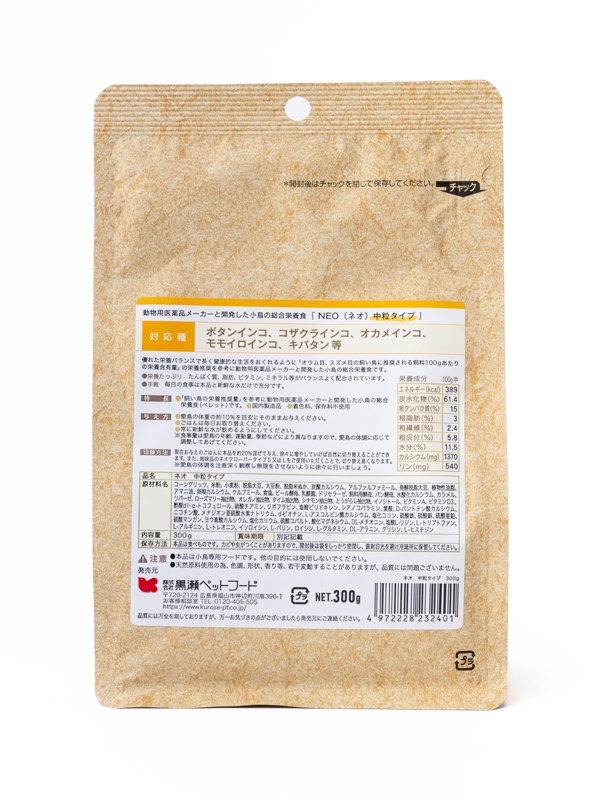 優れた栄養バランスで長く健康的な生活を送れるように「オウム目、スズメ目の飼い鳥に推奨される飼料100gあたりの栄養含有量」の栄養推奨を参考に、動物医薬品メーカーと開発した小鳥の総合栄養食(ペレットタイプ)です。