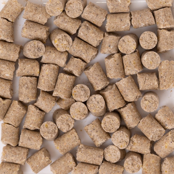 コーングリッツ、米粉、小麦粉、脱脂大豆、大豆粉、脱脂米ぬか、炭酸カルシウム、アルファルファミール、発酵脱脂大豆、植物性油脂、アマニ油、卵殻カルシウム、ケルプミール、食塩、ビール酵母、乳酸菌、ドリセラーゼ、飼料用酵母、パン酵母、水酸化カルシウム、カラメル、リパーゼ、ローズマリー抽出物、オレガノ抽出物、タイム抽出物、シナモン抽出物、とうがらし抽出物、イノシトール、ビタミンA、ビタミンD3、酢酸dl-α-トコフェロール、硝酸チアミン、リボフラビン、塩酸ピリドキシン、シアノコバラミン、葉酸、D-パントテン酸カルシウム、ニコチン酸、メナジオン亜硫酸水素ナトリウム、d-ビオチン、L-アスコルビン酸カルシウム、塩化コリン、硫酸鉄、硫酸銅、硫酸亜鉛、硫酸マンガン、ヨウ素酸カルシウム、塩化カリウム、硫酸コバルト、酸化マグネシウム、DL-メチオニン、塩酸L-リジン、L-トリプトファン、L-アルギニン、L-トレオニン、イソロイシン、L-バリン、ロイシン、L-グルタミン、DL-アラニン、グリシン、L-ヒスチジン