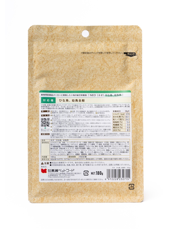 ひな鳥・幼鳥の栄養を考えたパウダータイプの総合バランスフードです。消化吸収を高めるために主原料にアルファ化した穀物を配合しているので、ぬるま湯でも溶けやすくなっています。必須脂肪酸であるDHAと善玉菌を増やし、悪玉菌を減らす整腸作用のある納豆菌、乳酸菌、その乳酸菌のエネルギーとなる水溶性食物繊維、新しい細胞を作り出すのに必要不可欠な成分、核酸を配合しています。安心安全の国内製造品です。