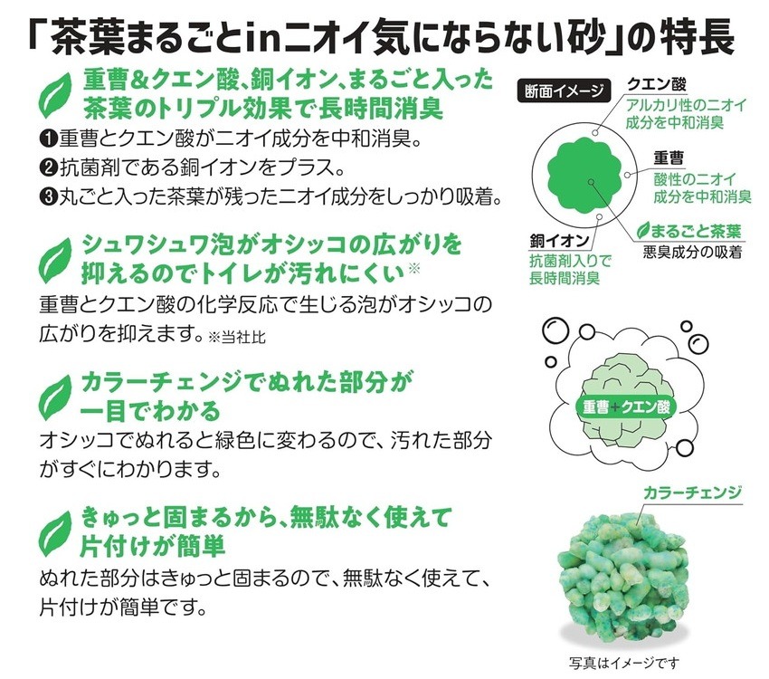 静岡茶葉使用。帰宅後もニオイ気にならない! ■重曹&クエン酸、銅イオン、まるごと入った茶葉のトリプル効果で長時間消臭。 ■シュワシュワ泡がオシッコの広がりを抑えるのでトイレが汚れにくい。 ■ぬれた場所の色が変わり、ギュッと固まるためあと片付けも簡単です。