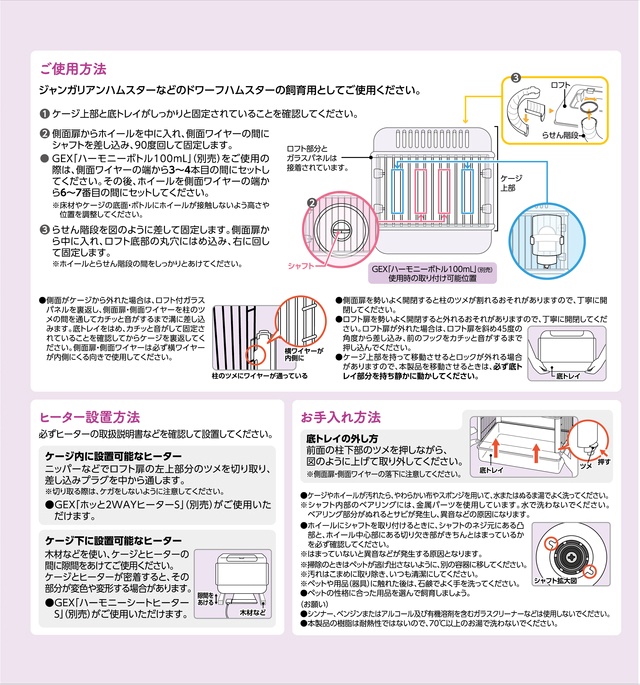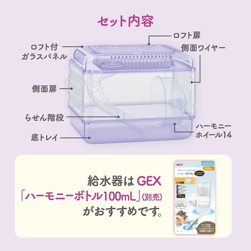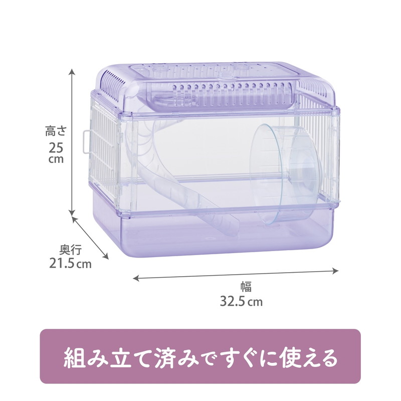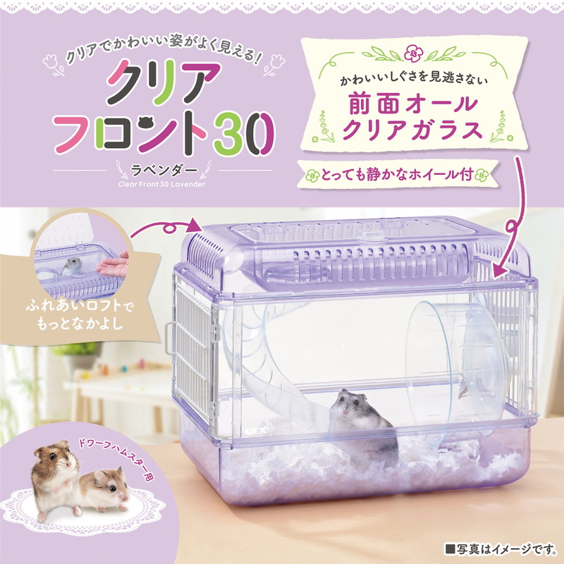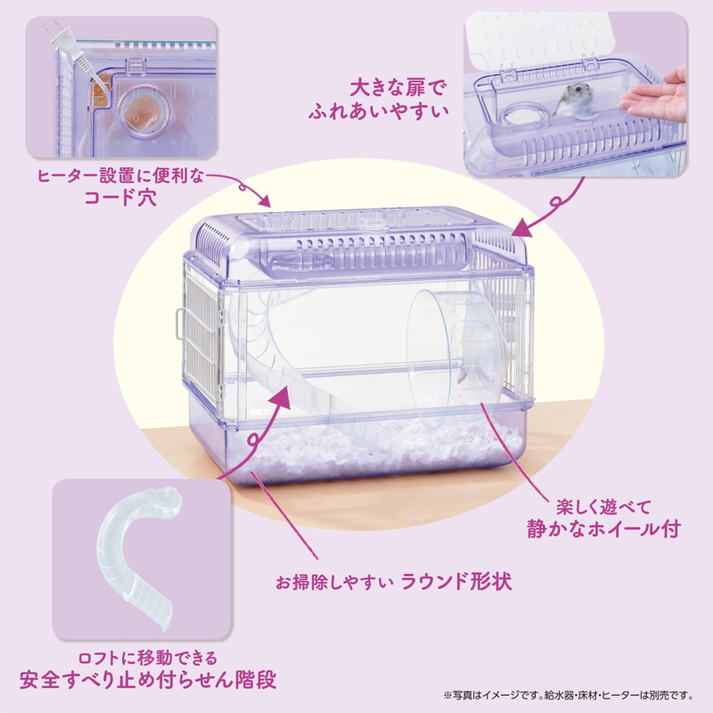 かわいいしぐさを見逃さない前面オールクリアガラス。 ★ふれあいロフトでもっとなかよし ★とっても静かなホイール付 ★組み立て済みですぐに使える ★大きな扉でふれあいやすい ★ヒーター設置に便利なコード穴 ★ロフトに移動できる安全すべり止め付らせん階段 ★お掃除しやすいラウンド形状 ★ドワーフハムスター用