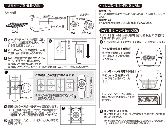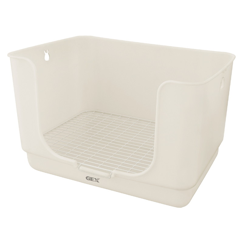 高さのあるオシッコガードで汚れが飛び散りにくい、うさぎ用トイレ!幅&奥行きひろびろなので、サークル飼育にも! 【幅&奥行きひろびろ】 幅41×奥行き30×高さ25cmの大きなトイレ!うさぎが快適に使用できます。ロップイヤー、ミニウサギなどの中型種に。サークルでの使用にも。 【いたずら防止設計】 特殊構造の「ロック式スノコ」なので、いたずら防止にも。 【汚れがたまりにくい構造!】 汚れがたまりやすいスノコの足部分をなくした「フラットスノコ」採用。スノコは広い網目(1.4cm)なので、うさぎの足やおしりが汚れにくい。「ロック式スノコ」により、お掃除のときも取り付け簡単!