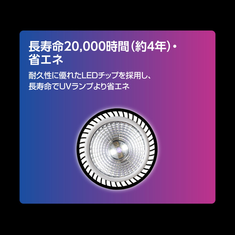長寿命20,000時間(約4年)、ピンポイントに紫外線を照射できる集光タイプ。
