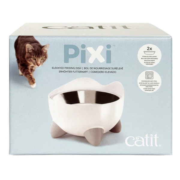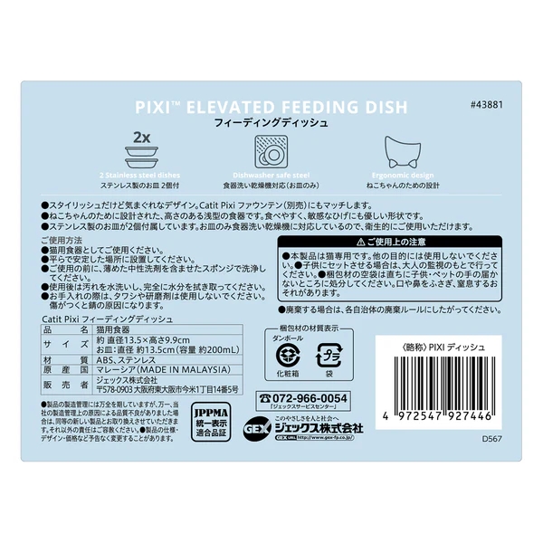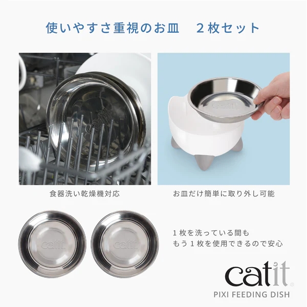 ・ねこちゃんのために設計されたちょうどいいお皿です。 ・食べる位置を高くすることで、首に負担をかけず、ねこちゃんが楽に食べられます。 ・おひげを邪魔しないように浅型に設計。ステンレスで清潔に使えるので皮膚が敏感なねこちゃんにも安心です。 ・清潔に保てるステンレス製のお皿は2枚セット。お皿のみ食器洗い乾燥機に対応。 ・Catit Pixi ファウンテン(別売)と一緒に使えるかわいいデザインです。 ・ステンレス製のお皿が2個付属しています。お皿のみ食器洗い乾燥機に対応しているので、衛生的にご使用いただけます。