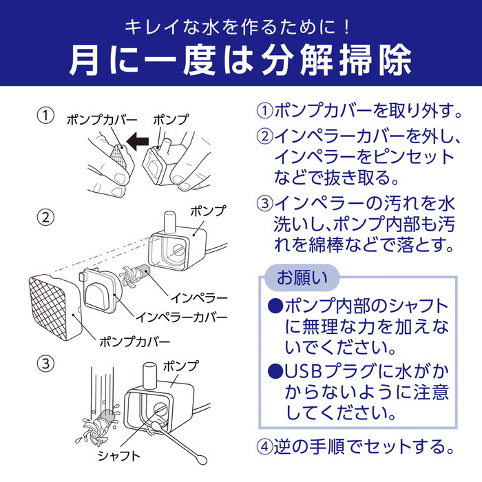 水が循環しなくなるおそれがありますので、約1ヶ月に1度は分解してポンプ内部を掃除してください。