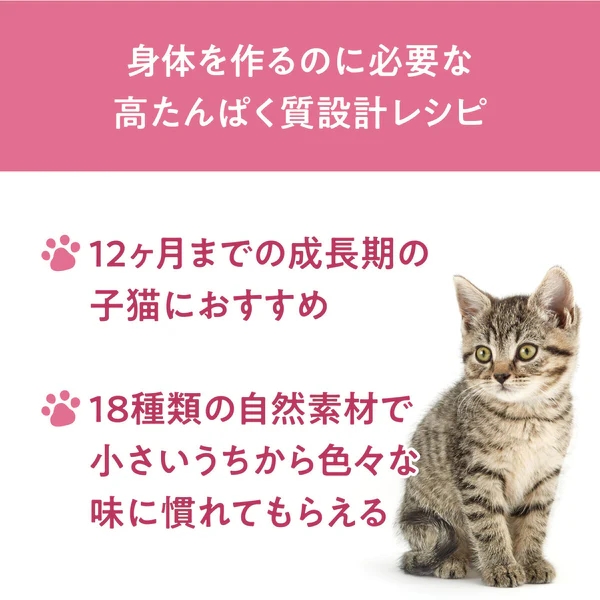 新鮮な鶏肉を使用した高タンパクのレシピで、子猫が必要とする動物性タンパクを効果的に供給します。