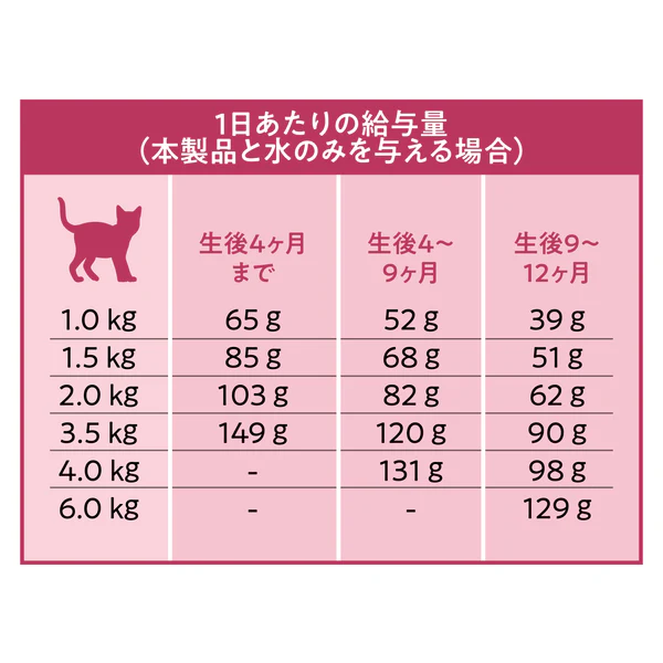 子猫の種類・性別・運動量・環境などにより必要量は異なるため、必要に応じて調整してください。
