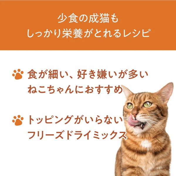 Catit Recipes成猫用はオメガ3脂肪酸、タウリン、プロバイオティクスを配合し、活動的なライフスタイルの成猫の健康を総合的にサポートする総合栄養食です。 愛猫の健康を考えて、18種類の高品質の自然素材を贅沢に配合 ホルモン剤・抗生物質を与えず育てた高品質な鶏を第一原材料として使用し、動物性タンパクを豊富に含みます。 89% 動物性たんぱく比率 新鮮な鶏肉を使用した高タンパクのレシピで、成猫が必要とする動物性タンパクを効果的に供給します。 ダブルフリーズドライ製法 フリーズドライ入りキブルとフリーズドライキューブをミックス。 フリーズドライの素材そのままのおいしさを加えました。 ①フリーズドライを加えた高タンパクのキブル 高タンパクで歯ごたえのあるキブルに、フリーズドライの素材そのままのおいしさをプラスしています。 ②素材のおいしさそのまま フリーズドライキューブ 鶏肉に、栄養豊富なサツマイモ・カボチャ・タラ肝・緑イ貝・昆布をミックスしてフリーズドライ。 おいしさをギュッと凝縮しました。 活動的なライフスタイルの成猫用レシピ プロバイオとプレバイオが腸の健康をサポート。 オメガ3脂肪酸配合で皮膚と被毛の健康維持を、タウリンで心臓と目の健康をサポートします。 猫に必要な素材だけを使用 トウモロコシ・小麦・大豆・グルテンミール・肉副産物・着色料・香料は一切使用していません。 粒サイズ キブルは約7mm、フリーズドライキューブは約9mm。 Catitオートフィーダーでも使用できます。