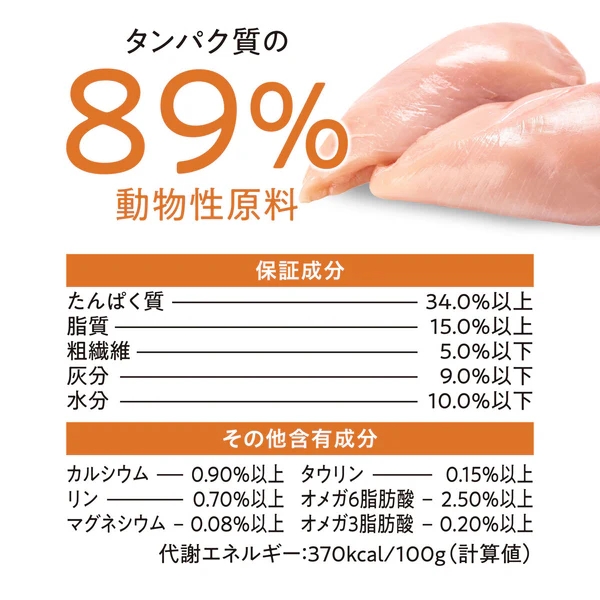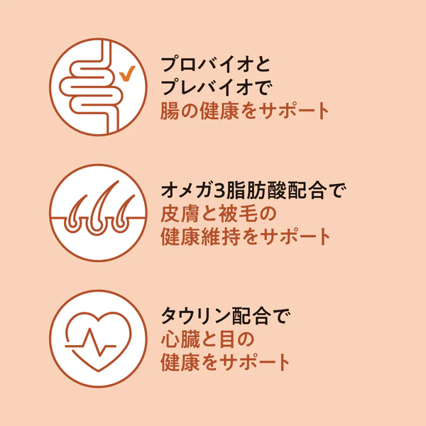 オメガ3脂肪酸配合で皮膚と被毛の健康維持を、タウリンで心臓と目の健康をサポートします。