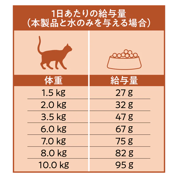 1日2~3回に分けて与えてください。 猫の種類・性別・運動量・環境などによって必要な食事量は変動しますので、必要に応じて調整してください。 新鮮な水をいつでも飲めるようにしてください。 食べ残しは腐敗の原因になりますので取り除いてください。