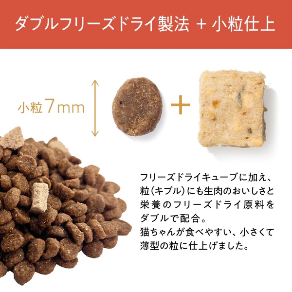 高タンパクで歯ごたえのあるキブルに、フリーズドライの素材そのままのおいしさをプラスしています。