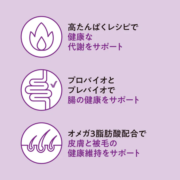 オメガ3脂肪酸配合で皮膚と被毛の健康維持をサポートします。