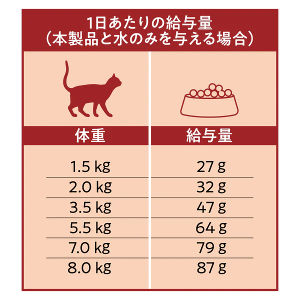 1日2~3回に分けて与えてください。 肥満気味の猫の場合は、現在の体重ではなく理想的な体重を目安にしてください。 猫の種類・性別・運動量・環境などによって必要な食事量は変動しますので、必要に応じて調整してください。 新鮮な水をいつでも飲めるようにしてください。 食べ残しは腐敗の原因になりますので取り除いてください。