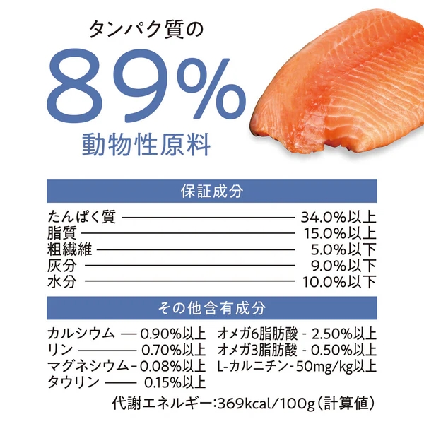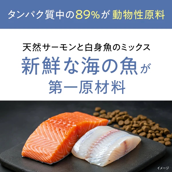 新鮮な海の魚(天然サーモンと白身魚)を第一原材料として使用し、動物性タンパクを豊富に含みます。