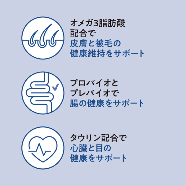 プロバイオとプレバイオで腸の健康をサポートし、タウリン配合で心臓と目の健康をサポートします。
