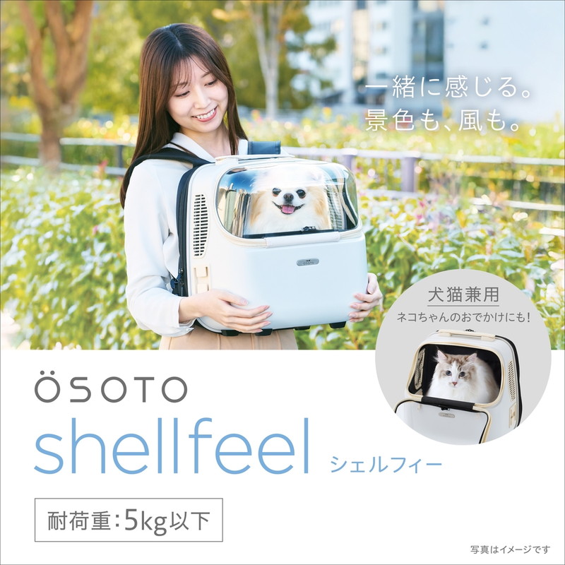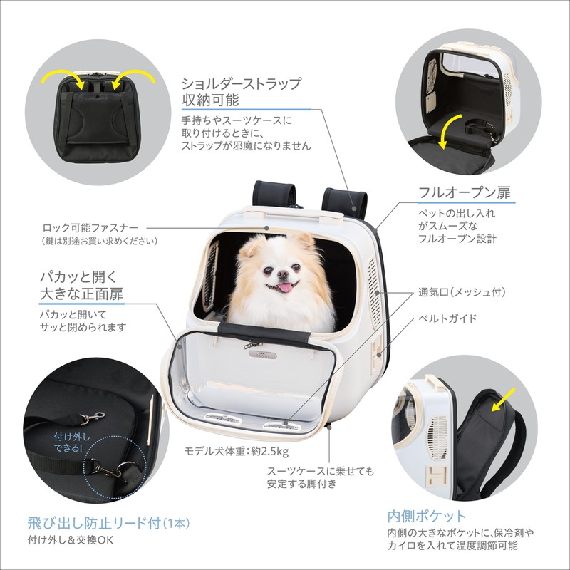 衝撃に強い、丈夫で安心なポリカーボネートを使用したリュック。 小型犬・猫にオススメサイズ。4通りのスタイルが可能な多機能仕様。 楽器ケースと同じ丈夫なポリカーボネート製。 耐衝撃性が高く、1.7kgなので軽量。 背負う、前抱き、手持ち、スーツケースやOSOTO コロフィー(別売)に取り付け可能。